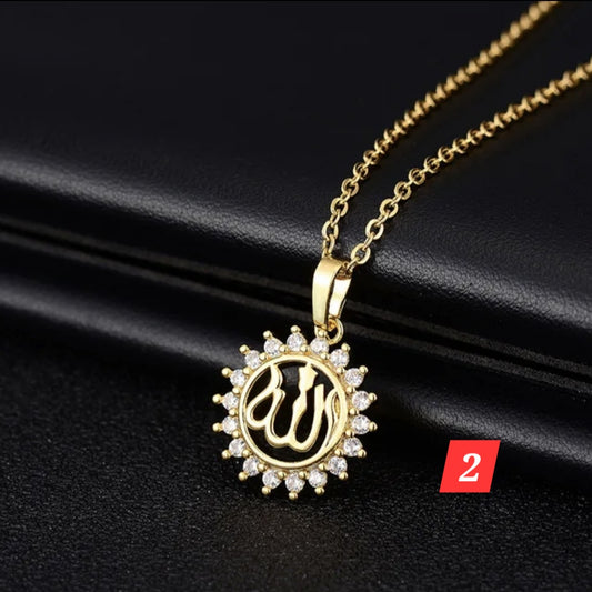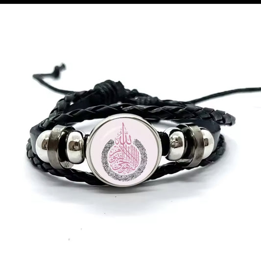 Islamic allah mohamed charm bracelet with a glass dome and snap button closure on stylish leather cord band.